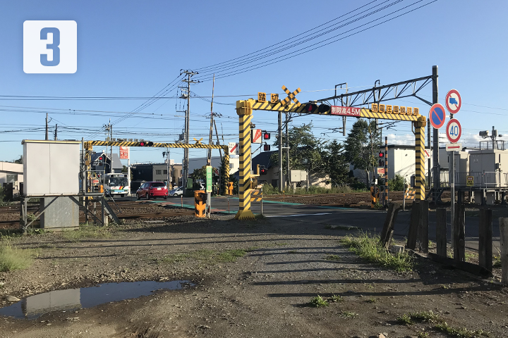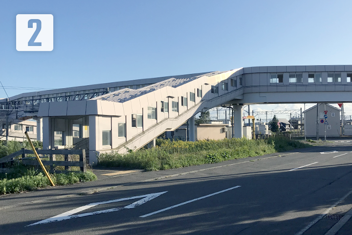 直線の道をしばらく進んで、大きな跨線橋(こせんきょう)を通過します。
